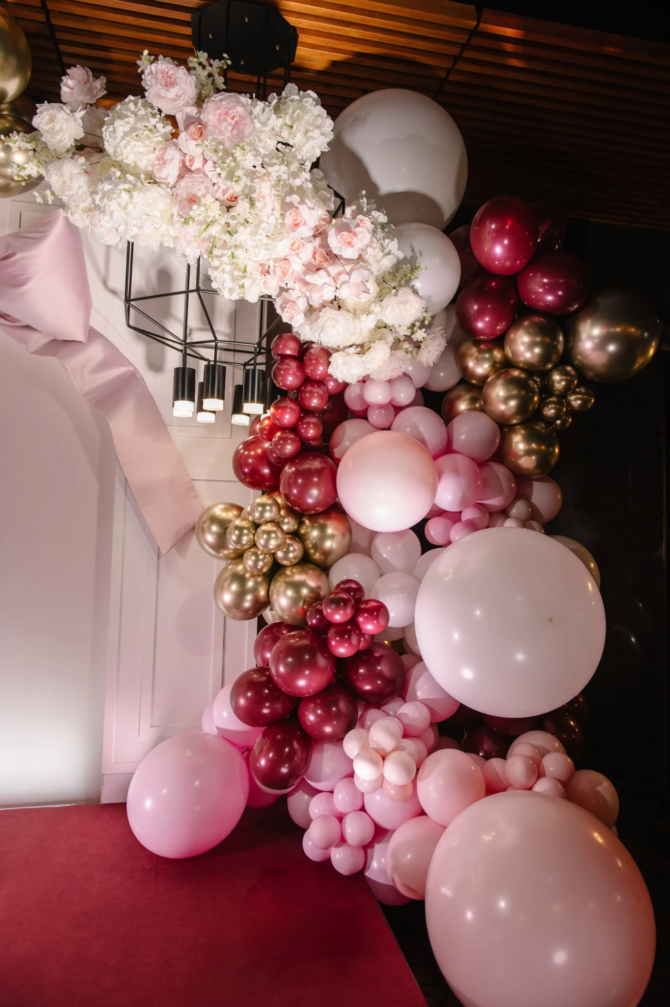 Elegant banquet table decorated with pink flowers, wine glasses, and red and white napkins in a sophisticated event space with a Christmas tree in the background. Social event, themed dinner with friends and family, girls' night, bridal events